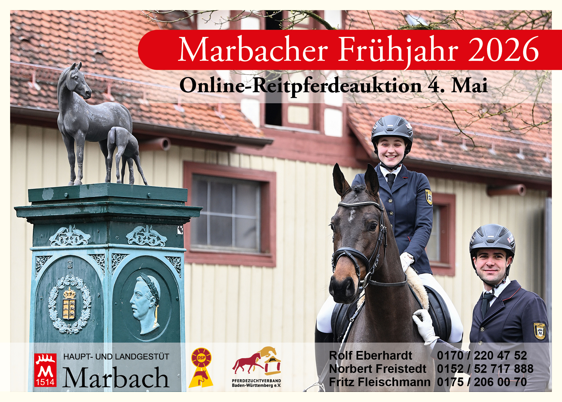 Marbach. Die Kollektion der Gemeinschaftsauktion „Marbacher Frühjahr 2026“ ist online. Der Pferdezuchtverband Baden-Württemberg e.V. und das Haupt- und Landgestüt Marbach präsentieren erstmalig eine gemeinsame Verkaufskollektion, die am Montag, den 4. Mai ab 18 Uhr im Rahmen einer Online Auktion versteigert wird.