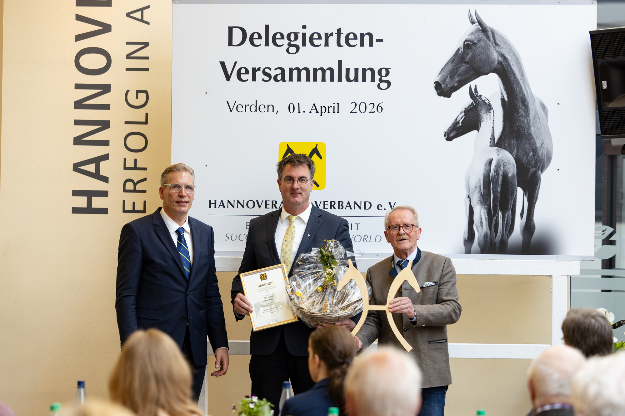 Der neue Präsident des Hannoveraner Verbandes, Dr. Frederic Bünger, stammt aus einer Familie, in der die Zucht von Hannoveraner Pferden seit vielen Generationen eine zentrale Rolle spielt. Seit über 20 Jahren ist er als Richter bei Stuten- und Fohlenschauen tätig. „Ich möchte meine Erfahrung und Leidenschaft einbringen, um die Ziele des Verbandes aktiv mitzugestalten und die Qualität der Zucht weiter zu fördern. Es stehen einige Neuerungen bevor, in denen ich positive Aspekte und enorme Chancen sehe“, sagte der Tierarzt aus Harbarnsen. Für sein großes Engagement und als Dank für die geleistete Arbeit erhielt der scheidende Präsident Dr. Hinni Lührs-Behnke die Goldene Ehrennadel des Hannoveraner Verbandes.