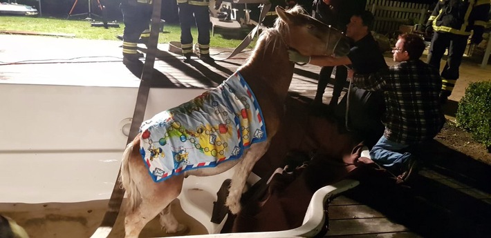 Da staunten die Bewohner eines Einfamilienhauses in Hamburg Duvenstedt offenbar nicht schlecht, als sie am späten Freitagabend Geräusche in ihrem Garten hörten. Sieben Pferde waren von der angrenzenden Koppel ausgebrochen und liefen nun frei umher. Eines stand nun im Garten des Hauses, ein weiteres Pferd war in den mit einer Plane abgedeckten 2 x 5 Meter großen Swimmingpool gefallen und stand nun bis zum Hals im Wasser. Von den Bewohnern wurde kurzerhand der Notruf 112 gewählt und die Feuerwehr Hamburg um Hilfe gebeten. Durch die Rettungsleitstelle wurden die Freiwillige Feuerwehr Duvenstedt, ein Löschfahrzeug der Feuer- und Rettungswache Sasel, sowie eine Tierärztin zu der Einsatzstelle alarmiert. Durch die Einsatzkräfte wurde der Pool bis auf eine Wassertiefe von einem Meter abgepumpt und das Pferd mit einer Decke gewärmt, es drohte eine Unterkühlung. Alle anderen sechs Pferde wurden eingefangen, an den mittlerweile eingetroffenen Besitzer übergeben und wieder auf die Koppel verbracht werden. Durch die Tierärztin wurde das Pferd sediert und konnte dann anschließend über eine in den Pool eingebaute Treppe diesen verlassen. Als Sicherung, damit das Pferd nicht die Treppe zurück rutschte, diente ein B-Schlauch, der von Einsatzkräften hinter dem Pferd geführt wurde. Nach einer Untersuchung durch die Veterinärin konnte das Pferd - unverletzt - an seinen Besitzer übergeben werden. Der Einsatz der Feuerwehr Hamburg dauerte insgesamt zweieinhalb Stunden.