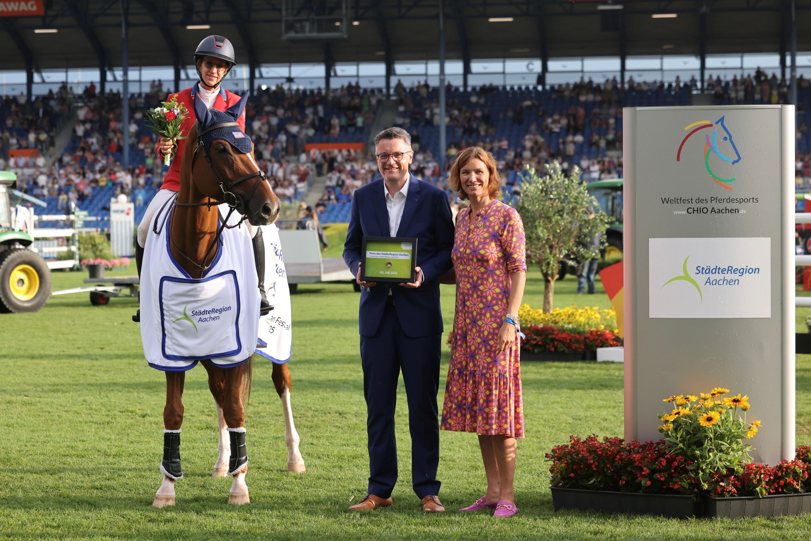 Foto: Das Foto zeigt die Siegerin im Preis der Städteregion beim CHIO Aachen 2025, Laura Kraut aus den USA auf Emeraldo gemeinsam mit StädteRegionsrat Dr. Tim Grüttemeier und ALRV-Präsidentin Stefanie Peters - Fotograf: CHIO Aachen/Andreas Steindl