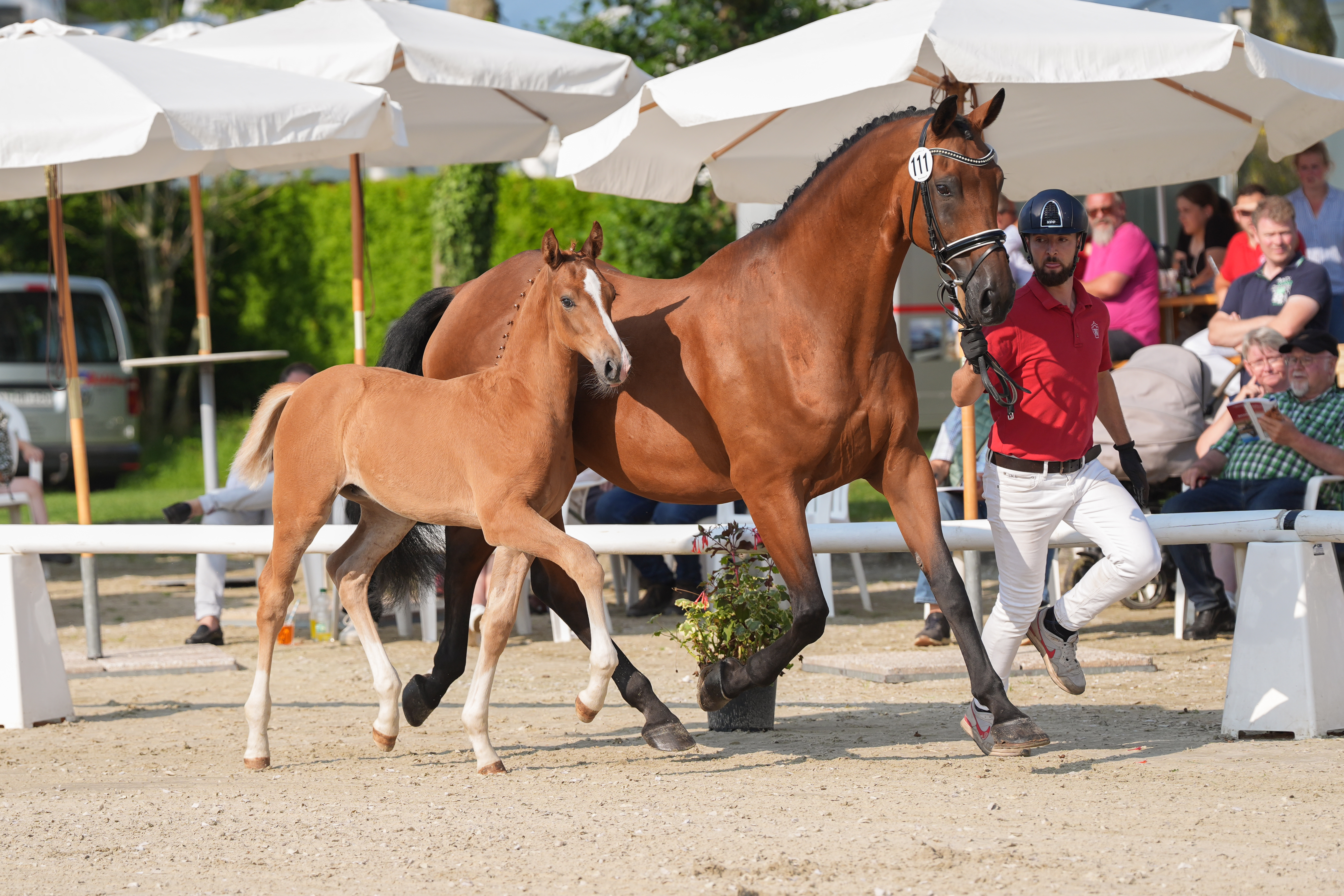 Olympisch war das Blut auch bei dem zweit- und drittteuersten Fohlen des Tages. Die Kopfnummern 114 und 115 stehen beide in enger Verwandtschaft zu Clooney, dem Erfolgspferd des Schweizers Martin Fuchs: Europameister und zweifacher Teilnehmer an Olympischen Spielen. Nur knapp unter der 30.000 Euro-Marke blieb die Kopfnummer 114. George Clooney ist der bezeichnende Name des Schimmelhengstes von Gigabyte. Seine Mutter, Cape Coral v. Cristallo I ist die direkte Tochter der Fräulein von Moor, die ihrerseits die Mutter von Clooney ist. Wie Clooney stammt dieses Hengstfohlen aus der Zucht des ehemaligen Westfälischen Auktionators und Auktionsleiters Bernd Richter. Bei 29.000 Euro fiel der Auktionshammer für diesen Nachwuchsstar. 25.000 Euro war Kunden die Kopfnummer 115 wert. Der Name Everlasting Clooney weist auch hier auf den Erfolgsstamm hin. Mit 25 Jahren trabte die direkte Mutter von Clooney, Fräulein von Moor, noch einmal mit ihrem Sohn aus 2024 in die Bahn. Paul Focke, Rheine, hatte im vergangenen Jahr die Ferragamo-Tochter mit Emeron angepaart. Beide Fohlen sicherte sich der gleiche Kunde vor Ort in Münster-Handorf als Nachwuchspferde.