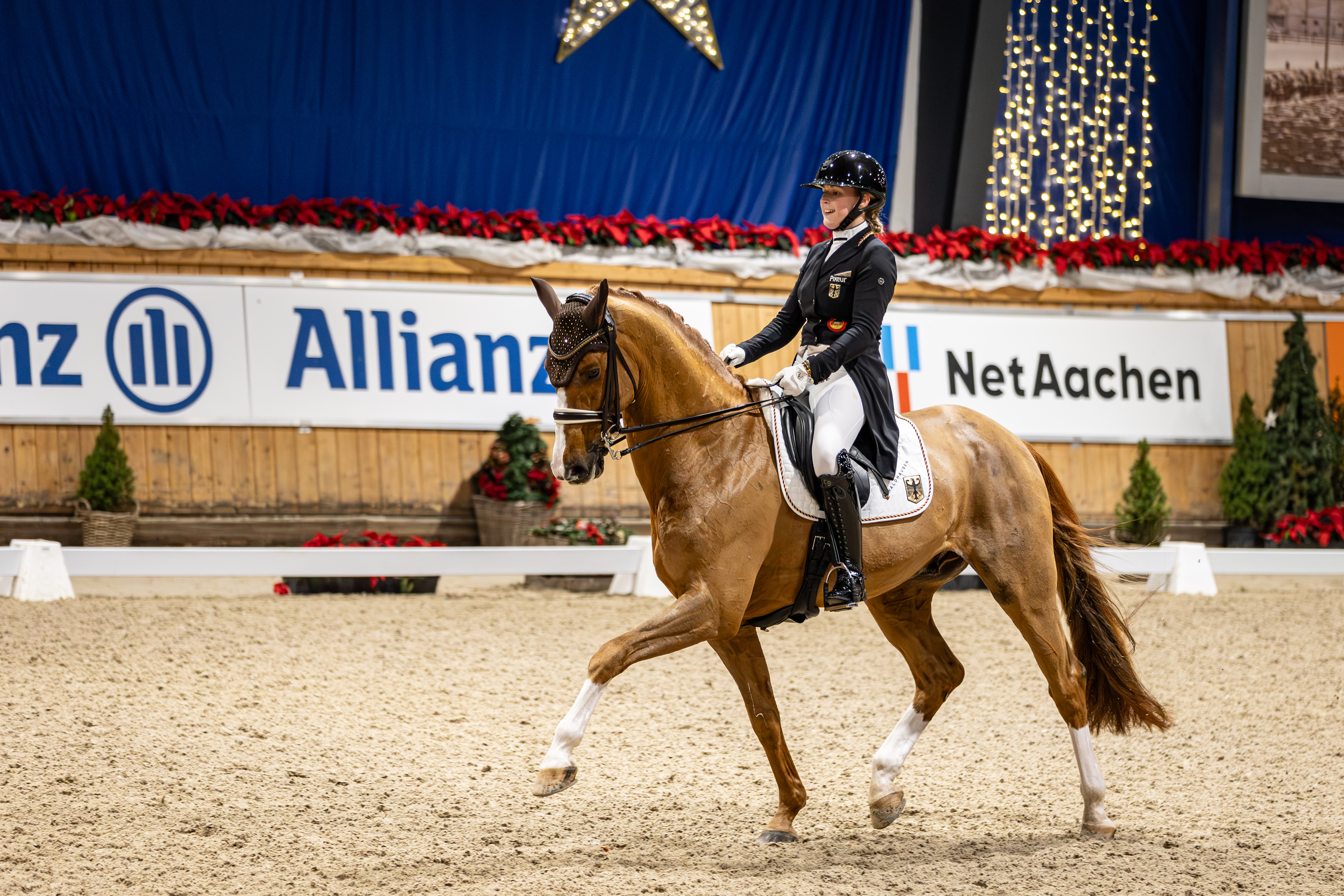 Zu den Klängen von James Blunt brillierte das Duo im Viereck und wurde mit einer persönlichen Bestleistung von 77,108 Prozent belohnt. „Es ist wahnsinnig besonders, hier einmal ganz vorne stehen zu dürfen. In Aachen überhaupt starten zu dürfen, ist schon ein Traum – und dann gleich so einen Hattrick hinzulegen, ist einfach unglaublich“, strahlte Alix von Borries sichtlich bewegt nach ihrem Erfolg.