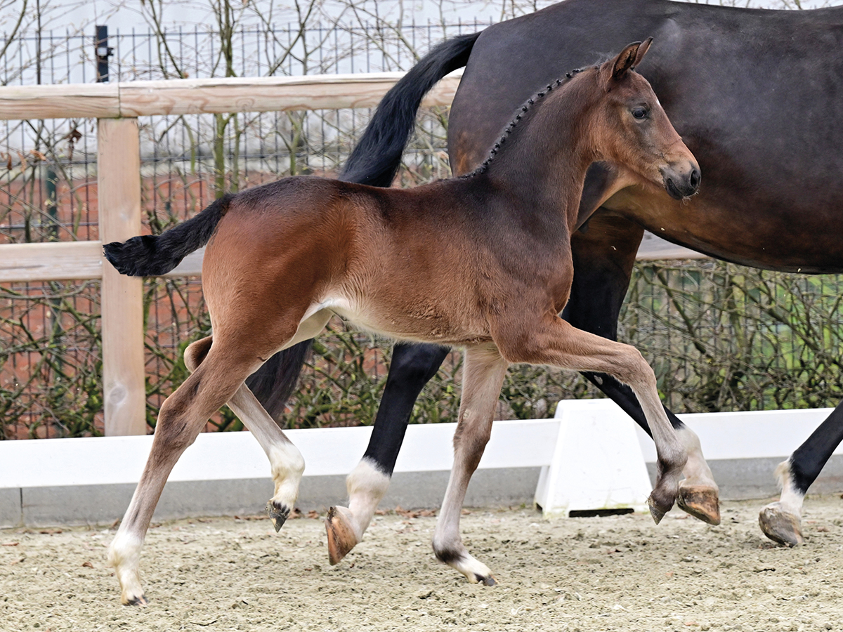 Im Dressurbereich ergänzt eine bewegungsstarke Tochter des Escaneno die Kollektion. Ihr Pedigree vereint moderne Dressurvererber wie Don Olymbrio L und Hotline mit einer sporterprobten Familie, aus der erfolgreiche Pferde bis in den gehobenen Dressursport hervorgegangen sind.