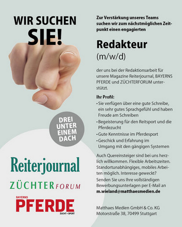 Zur Verstärkung unseres Teams suchen wir zum nächstmöglichen Zeitpunkt einen engagierten Mitarbeitenden (m/w/d), der uns bei der Redaktionsarbeit für unsere Magazine REITERJOURNAL, BAYERNS PFERDE und ZÜCHTERFORUM unterstützt.