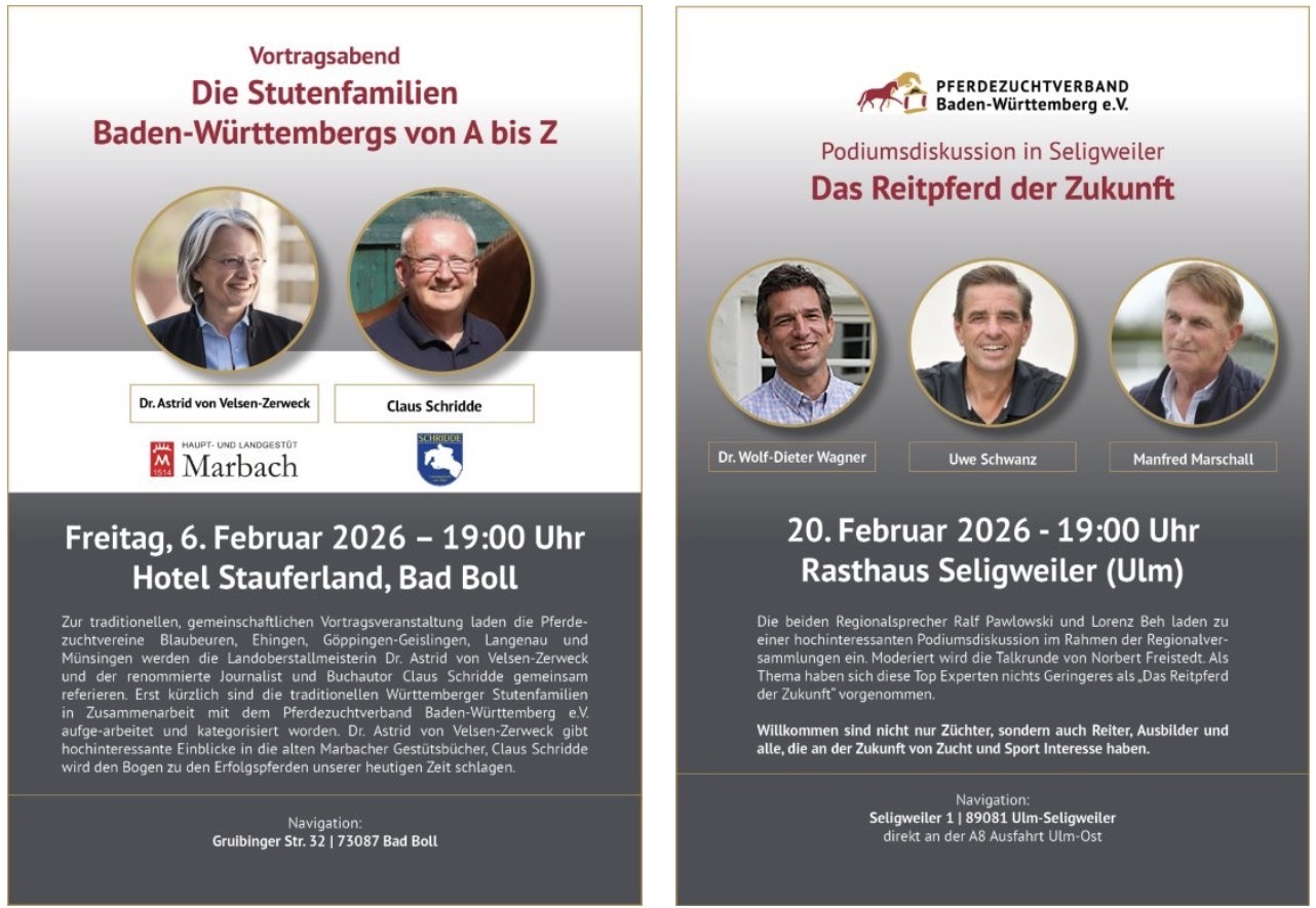 Am Freitag, 6. Februar 2026 um 19:00 Uhr laden die Pferdezuchtvereine Blaubeuren, Ehingen, Göppingen-Geislingen, Langenau und Münsingen herzlich zum gemeinsamen Vortragsabend ins Hotel Stauferland in Bad Boll ein. Landoberstallmeisterin Dr. Astrid von Velsen-Zerweck und der renommierte Journalist & Buchautor Claus Schridde geben spannende Einblicke in die neu aufgearbeiteten und kategorisierten Württemberger Stutenfamilien. Von den historischen Marbacher Gestütsbüchern bis hin zu den Erfolgspferden der Gegenwart spannt sich ein faszinierender Bogen durch Zuchtgeschichte und Moderne.