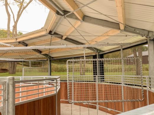• Runde Führanlagen mit Hufschlagüberdachung – Größen: 15, 18 und 20 m, verzinkt, Antriebssystem: Ring und Turm