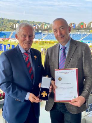 Sein Leben lang ist Carl Meulenbergh den Pferden im Allgemeinen und dem CHIO Aachen im Besonderen eng verbunden. Zunächst als selbstständiger Landwirt und Züchter, später in politischen Funktionen und seit 26 Jahren auch in verschiedensten Ehrenämtern beim CHIO-Ausrichter Aachen-Laurensberger Rennverein e.V. – zuletzt von 2010 bis 2020 als Präsident. In dieser Zeit habe er sich „durch Sachverstand und Ausgeglichenheit“ auch um die stets guten Beziehungen zwischen „dem größten Pferdesportverband der Welt und dem weltbesten Turnier“ sehr verdient gemacht, so Hans-Joachim Erbel, Präsident der Deutschen Reiterlichen Vereinigung (FN). Für diesen Einsatz und sein gesamtes Tun wurde Carl Meulenbergh jetzt von Hans-Joachim Erbel am Rande des CHIO Aachen 2021 mit dem Deutschen Reiterkreuz in Gold der FN ausgezeichnet. Erbel übermittelte zudem die herzlichsten Grüße seines Vorgängers Breido Graf zu Rantzau und übermittelte Glückwünsche im Namen des gesamten FN-Präsidiums.