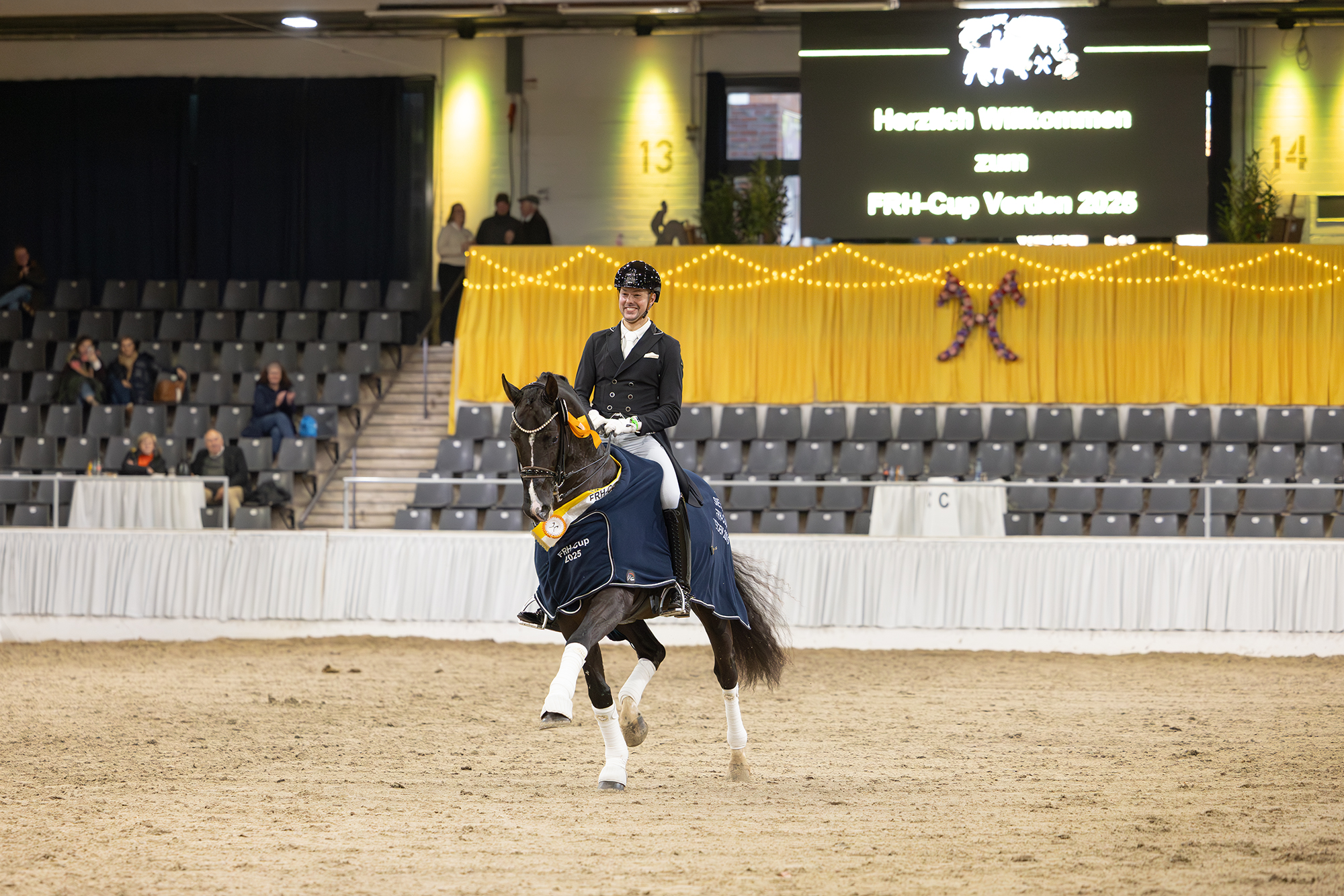 Verden. Die dritte Auflage des FRH-Cups in Verden sah strahlende Sieger. Bon Courage und Thomas Schulze gingen mit der weiß-gelben Siegerschärpe auf die Ehrenrunde, gefolgt von Zuperman OLD mit Beatrice Hoffrogge und Manolo FRH mit Borja Carrascosa im Sattel. Bei dieser Gelegenheit wurde zum ersten Mal der neu geschaffene Madeleine Winter-Schulze-Preis an Stephan Kurz, dem Züchter von Mount St John Freestyle, vergeben.