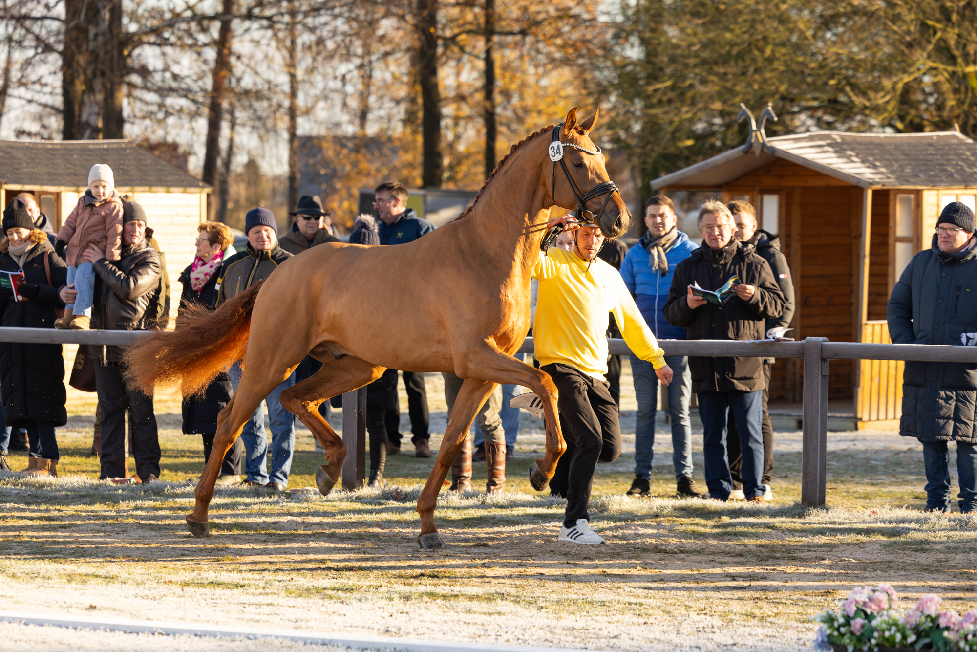 Der erste Hengst des Hengstmarktes war ein Valdiviani/Feinrich-Sohn (Z.: Dr. Norbert Grittern, Heinsberg, Ausst.: Theo Lenzen, Mönchengladbach), der mit großem Applaus gefeiert wurde. Nach spannendem Bieterduell bewies eine Kundin aus den USA online das größte Durchhaltevermögen und ersteigerte den Braunen für 365.000 Euro.