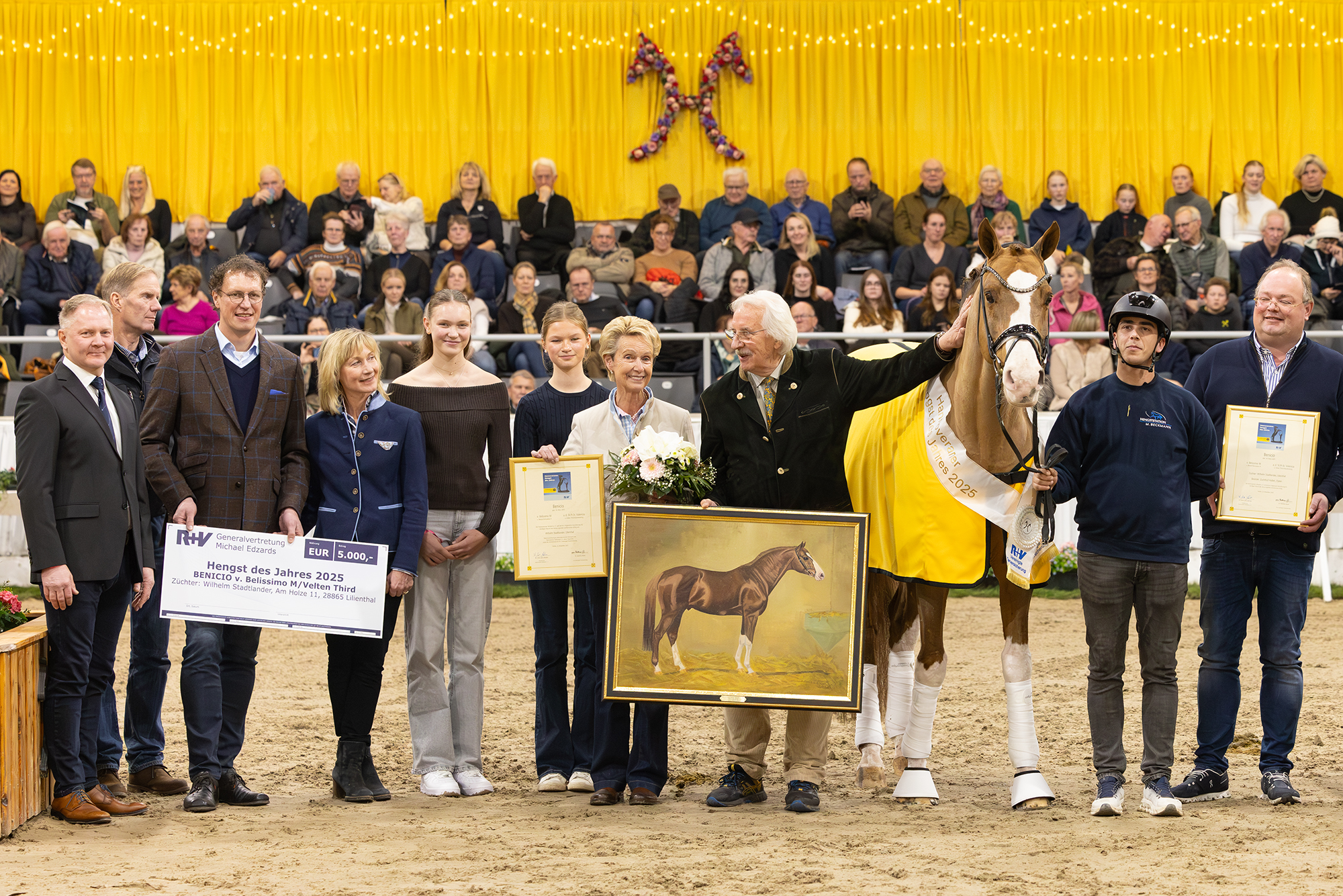Verden. Der Hannoveraner Hengst des Jahres 2025 heißt Benicio. Er gibt seinen Nachkommen in zuverlässiger Gleichmäßigkeit Typ, Stabilität und Rittigkeit mit. Dabei sah es anfangs gar nicht danach aus, als würde der heute 20 Jahre alte farbenfrohe Dunkelfuchs eine Beschälerkarriere in Deutschland starten. Die Familie des verstorbenen Züchters Wilhelm Stadtlander nahm die Auszeichnung entgegen: ein Ölgemälde des Künstlers Manfred Busemann sowie einen gutdotierten Scheck. Gemeinsam mit der R+V/Vereinigte Tierversicherung zeichnet der Hannoveraner Verband seit über 30 Jahren einen bedeutenden Hannoveraner Hengst aus.