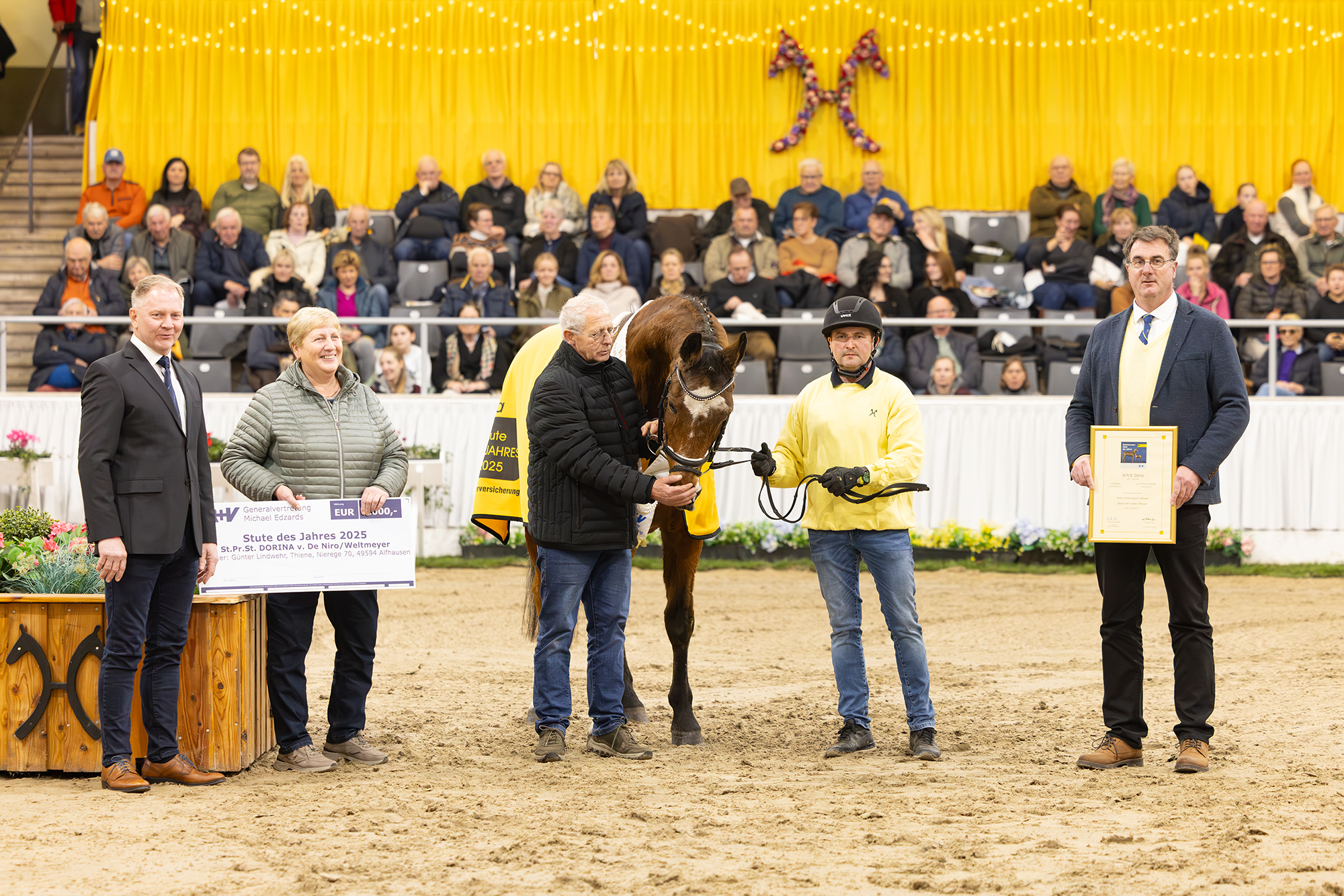 St.Pr.St. Dorina v. De Niro/Weltmeyer/Bolero wurde 2002 bei Günther Lindwehr in Alfhausen geboren. Auf dem Hof Lindwehr ist sie auch heute noch zu Hause. Im vergangenen Jahr kam im 17. Zuchtjahr ihr 17. und letztes Fohlen zur Welt. Die schauerfolgreiche Braune stellte mit ihren Fürstenball-Töchtern Fürstenfee und Hann.Pr.St. Franziska L die Siegerfamilie in Badbergen. Hann.Pr.St. Franziska L wiederum stellte auf der Stutenschau 2024 mit zwei Töchtern von F-D’avie und Vitalis eine Elite-Familie. Dabei war die Vitalis-Tochter keine Geringere als Hann.Pr.A. Ext+ Vision L, Herwart von der Decken-Schau-Siegerstute und Bundeschampionatsfinalistin 2024. Doch vor ihrem Zuchteinsatz zeigte St.Pr.St. Dorina ihre Dressurpferdequalitäten auch im Turniersport. Mit Stefan Kleine-Klanker war sie in Reitpferdeprüfungen und Dressurpferdeprüfungen der Klassen A und L siegreich.