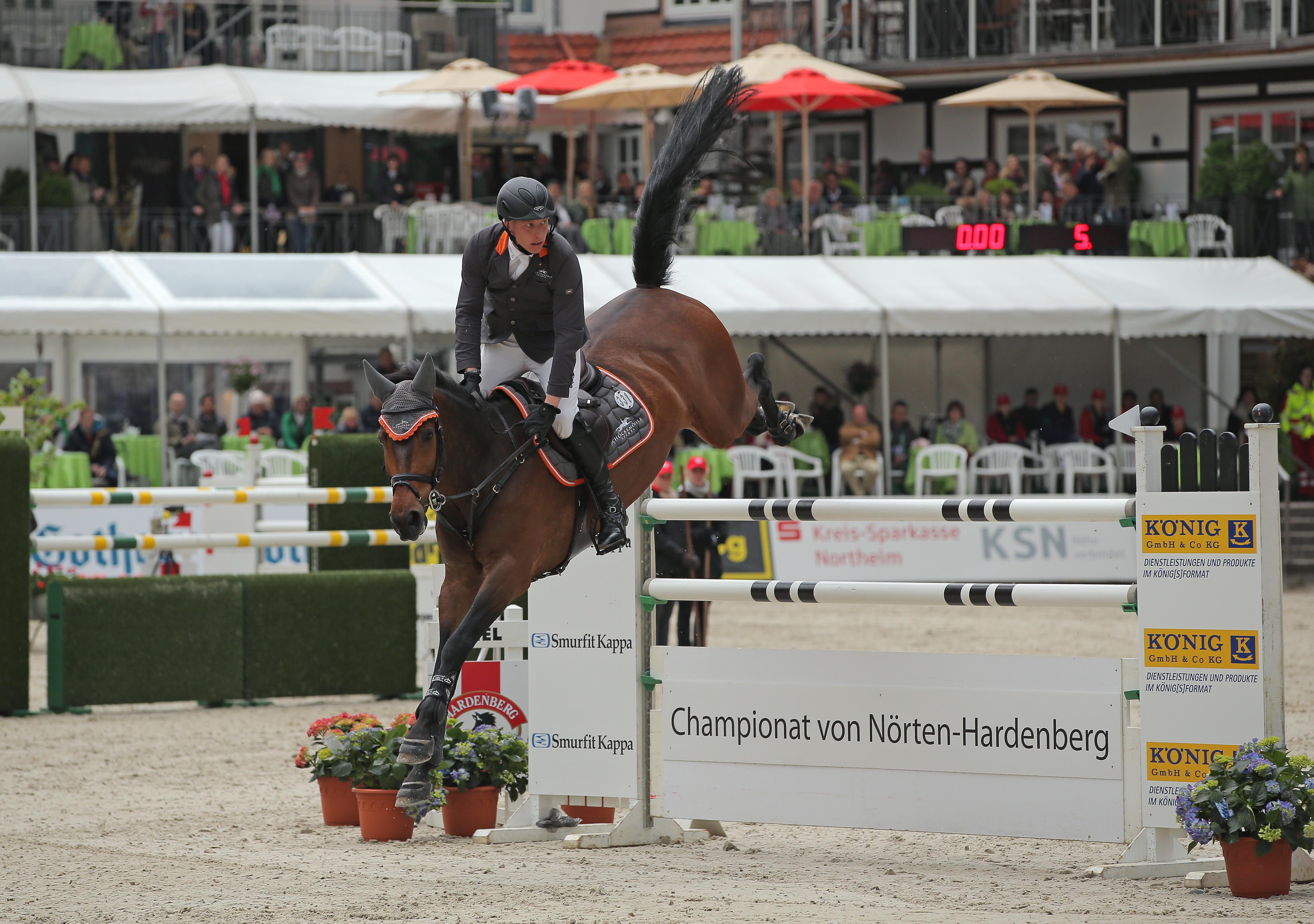 Marcus Ehning vertraute im Championat von Nörten-Hardenberg auf den Westfälischen Landbeschäler Cornado NRW. Der Schimmel zeigte sich nach dreimonatiger Turnierpause ausgesprochen frisch und bestens aufgelegt. Der Hengst ging zwischenzeitlich Vaterpflichten nach. Im Großen Preis um die legendäre „Goldene Peitsche“ will der Borkener allerdings seine Stute Sabrina einsetzen. Ehning ist Titelverteidiger, gewann 2012 mit Copin van de Broy die Prüfung.