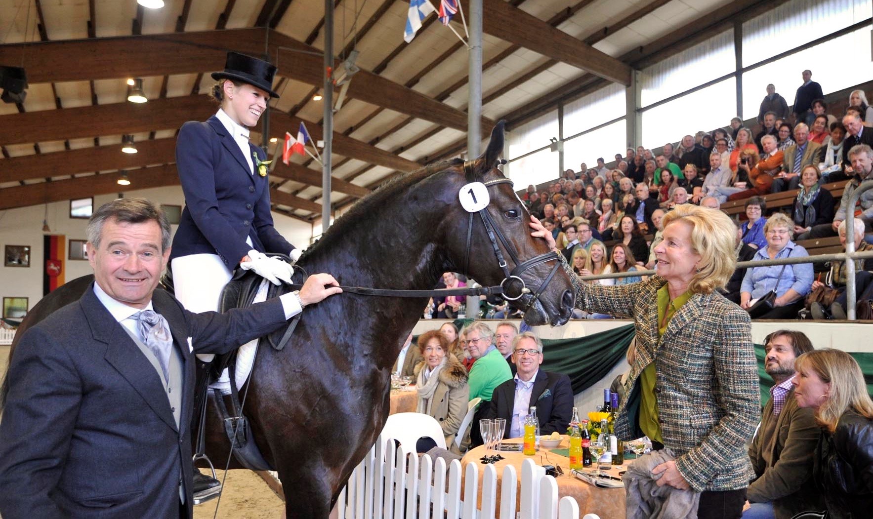 Foto: Der gekörte Hengst Sommelier wurde einst über die Herbstauktion auf dem Klosterhof verkauft - hier stellten Burkhard Wahler und Tochter Theresa den dunklen Beau seiner Besitzerin genauer vor - Fotograf: Beelitz