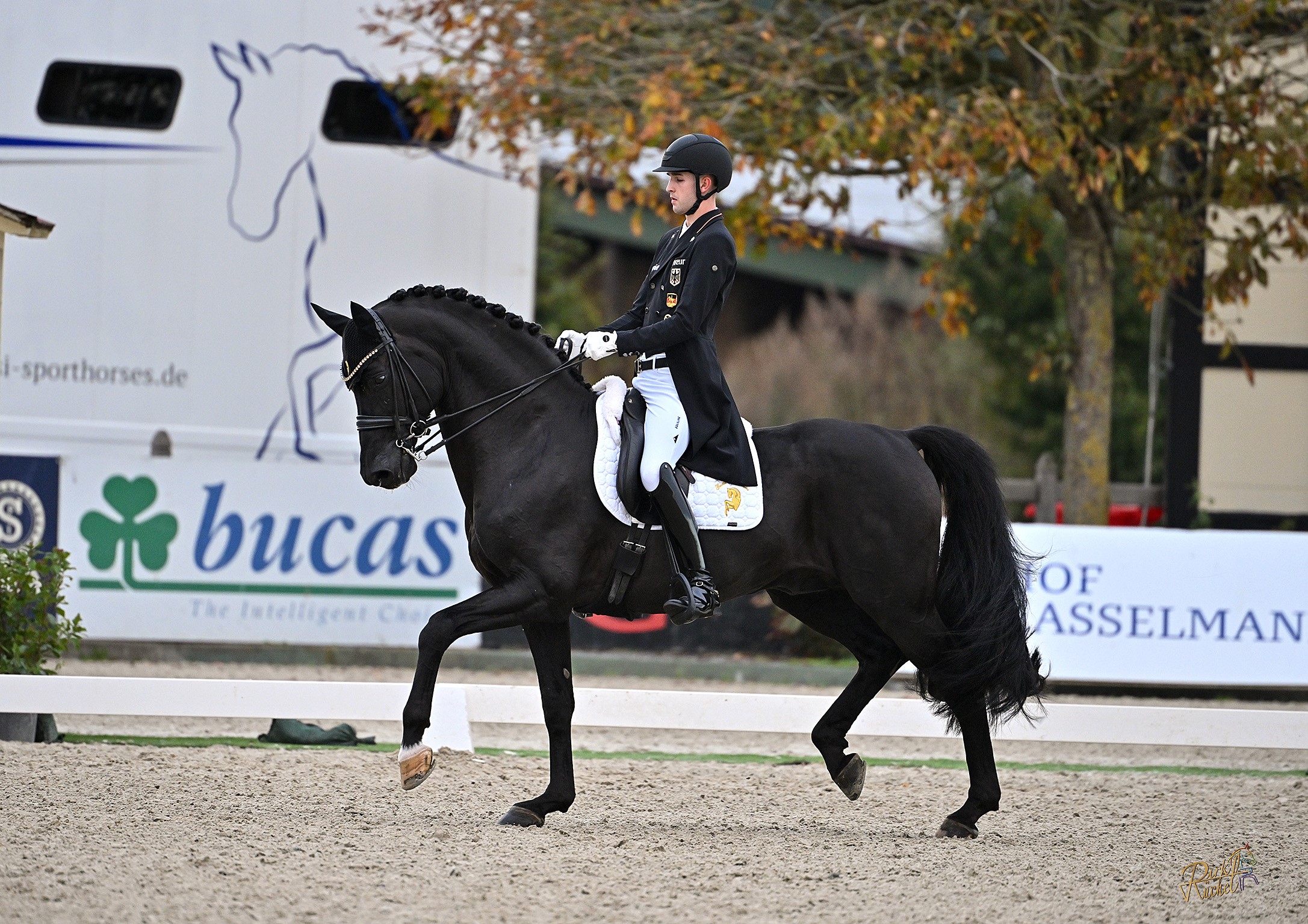 Moritz Treffinger hatte dieses Jahr bereits zwei Stationen des Piaff-Förderpreises dominieren können, in Mannheim siegte er mit Fiderdance, in Balve mit Cadeau Noir. Mitte Juli wurde er in Kronberg mit Cadeau Noir Europameister der U25-Dressurreiter in der Kür. Ein Sieg im Piaff-Förderpreis-Finale wäre die berühmte “Kirsche auf der Sahnetorte” wie der 22-Jährige zugibt. Extra Druck seiner Favoritenrolle gerecht zu werden verspüre er nicht, eher noch mehr Gelassenheit: “Dieses Jahr war bereits so phänomenal, egal was morgen passiert. Wir sind heute heil durchgekommen, das war eine gute Vorbereitung. Morgen müssen wir noch eine Schippe drauflegen, da starten alle wieder bei Null. Ich glaube, wir sind ein sehr, sehr starkes Team hier, es ist ein tolles Turnier und ich freue mich auf das Finale. Ich drücke allen die Daumen!” Die Piaff-Förderpreis- Finalprüfung findet am Samstagabend um 20:45 Uhr auf dem Hof Kasselmann statt, hier wird der internationale Grand Prix Test der Senioren geritten.